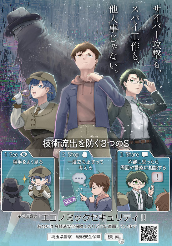 深澤さんの作品(写真)は、アニメなどのキービジュアルをイメージしたイラストと「サイバー攻撃も、スパイ工作も、他人事じゃない。」というキャッチコピーを上半分に配置。下部では、「技術流出を防ぐ3つのS」として「See=相手をよく見る」「Stop=一度立ち止まって考える」「Share=不審に思ったら周囲や警察に相談する」の意味をイラストとともに紹介し、注意を呼びかけている。