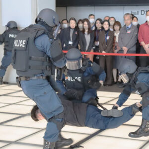 大阪府南署は3月4日、「M-1グランプリ2025」で優勝したお笑いコンビ「たくろう」のきむらバンドさんと赤木裕さんに一日警察署長を委嘱し(写真)、大阪市立中央会館で自転車安全運転教室を開催した。